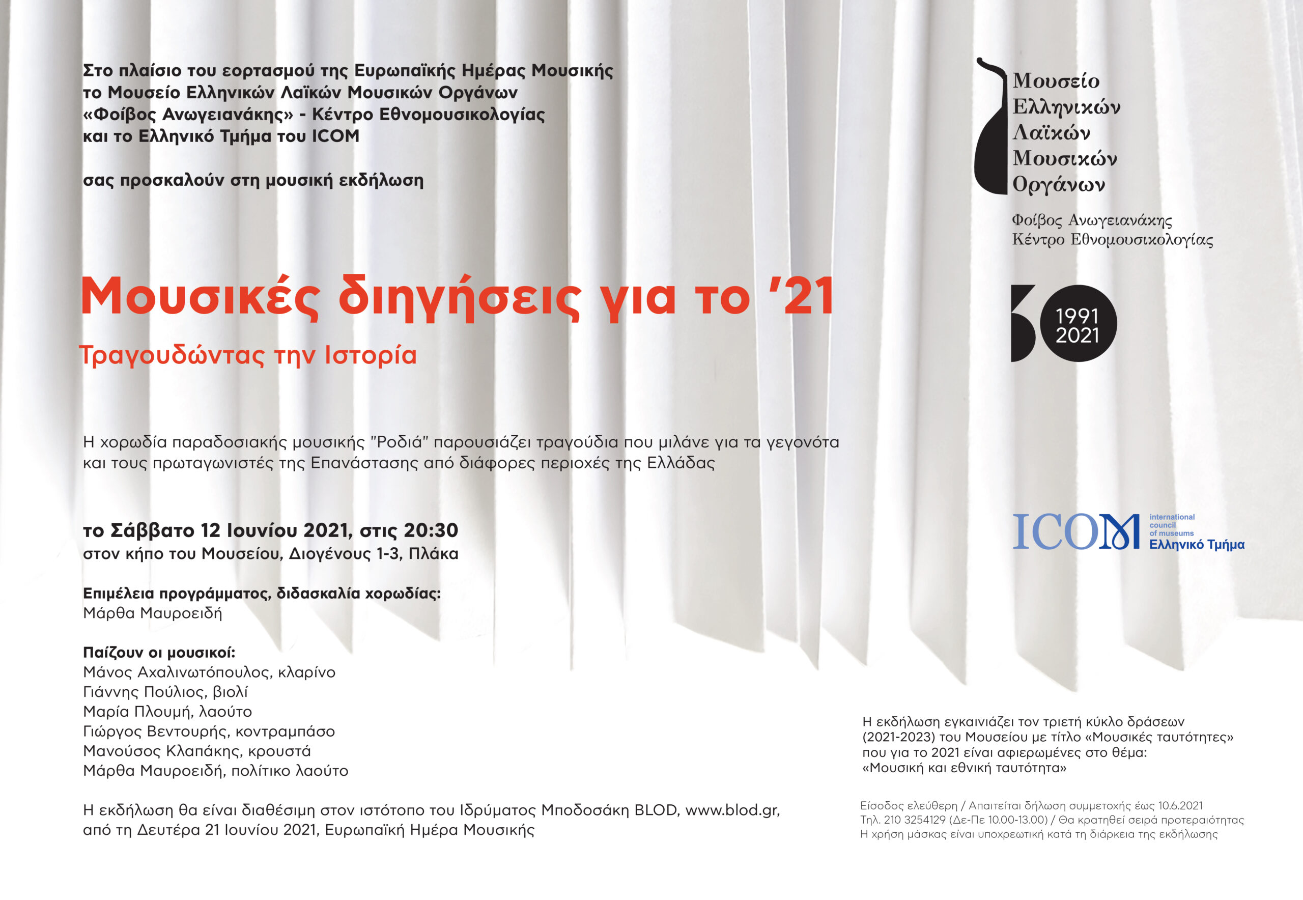 Το Μουσείο Ελληνικών Λαϊκών Μουσικών Οργάνων «Φοίβος Ανωγειανάκης» – Κέντρο Εθνομουσικολογίας και το Ελληνικό Τμήμα του ICOM, στο πλαίσιο του εορτασμού της Ευρωπαϊκής Ημέρας Μουσικής 2021, διοργάνωσαν μουσική… Read More
